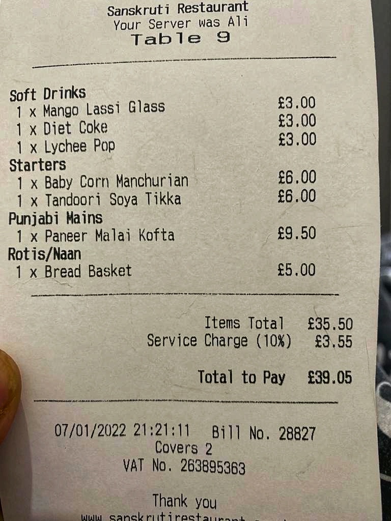 Ā Ā Ā Read moreI am usually a huge fan of Sanskruti, and as a local vegan business owner I am constantly sending people down there, but I was left a little disappointed with my recent visit. The food was really good as I have always found to be the case, but unfortunately it was the service and knowledge of the staff which really let it down today. I have a tomato allergy, something which I know can be really difficult to accommodate, so I donāt mind at all if all I can have is bread. On a previous visit I was given a list of about 8 dishes I could order, plus some starters and sides, and felt really confident that they understood the menu and what I needed from them. On this occasion I asked a staff member who said he would go and check with the kitchen, then vanished for almost half an hour. In that time the rest of the table was asked to order, but I still had to wait. I had to explain twice to the staff member who took the tableās order that I was waiting to find out what I could have as he kept trying to take my menu. When the staff member did come back it seemed to me that he hadnāt actually spoken to anyone, and I ended up just ordering the dosa. When they brought mine out they made a point to say it had no tomato, which would have been a nice touch if someone hadnāt come over 5 minutes later to inform me that one of the sauces actually was tomatoey. Thankfully I hadnāt started eating yet as no one else had been served, but it was really disappointing that they got that so wrong. We also had to ask for tap water several times before it was brought over, werenāt offered any more drinks until the end of the meal, and at the end we were just brought the bill without even being offered a chance to look at the dessert menu. I really hope that next time I go Iām able to bump this score up as my previous experiences have...