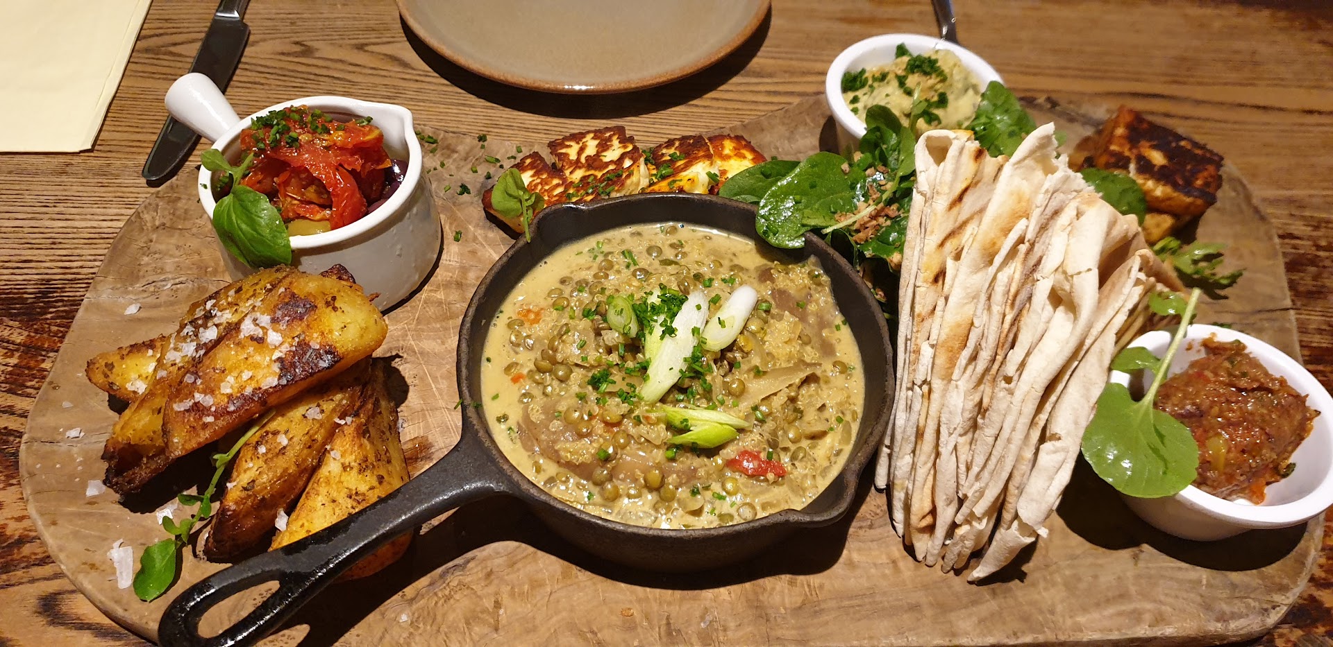 Went with my sister for an early lunch/ brunch and ordered the meat Meze. The idea of the food was great, loads of picky bits and a spicy chicken cooked in juices with chorizo, etc. Flatbreads were a great addition. Although after a couple of bites, I seemed to go through my drink quite quickly. It was extremely salty, even the wedges and the chicken. My only respite was the tomato ketchup, which I asked for, the sweetness seemed to counter act the salt. It didn't go completely to waste as my sister took some home for later. I only had a couple of wedges and a snall piece of chicken, so I unfortunately didn't get my money's worth. I will however compliment the non alcoholic cocktail(Calypso), which was superb, as drinks go, I would be back for that without a doubt, lovely...