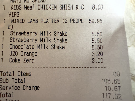 For 3 calamari pieces (£7,5) 5 cubes of lamb with 3 half baby tomatoes and 1 leaf of lettuce and half of a cup of rice (£20). Another lamb skewers dish with yogurt and bread £24, I had order extra rice as it didnt come with it… and there were barely any lamb in it..lamb was poor quality a bit old and chewy.. 3 drinks, we paid £75 ????????