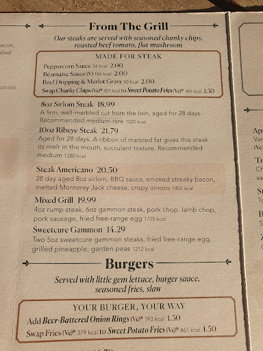 4 of the 5 of us ordered from the grill for mains and unfortunately we were super disappointed. If you’ve ever bbq’d on a dirty bbq and found that sooty burnt taste all over your meat, that’s what we had. It was a shame as the steak quality wasn’t great, they were cooked correctly but because of the taste of the burnt bbq bits all over the meat it ruined the whole steaks. The other person had cod and chips and was lovely! No issues at all. Our fries and sides were tasty too, our waitress noticed how much was left with the steaks and asked us so we explained, offered replacements or new meals, but we were ok and full enough from other bits and decided we’d just move onto desserts. They then came back and had removed all the steaks from the bill which we didn’t expect but was very nice of them to do. Desserts again were completely lovely, two had iced cream sundaes and they were great, one had a brownie which was ok but quite tough, a bit valet rather than a brownie. Not 100% on it and personally wouldn’t get that again. All in all, if we were stopping for a drink and a light bite we’d go here for starters and drinks, but we wouldn’t return for a meal again nor recommend it as a place for visitors and friends. There’s better options for a full meal around, but the staff here are lovely, professional and polite, can’t fault any of that. The grill just needs a...