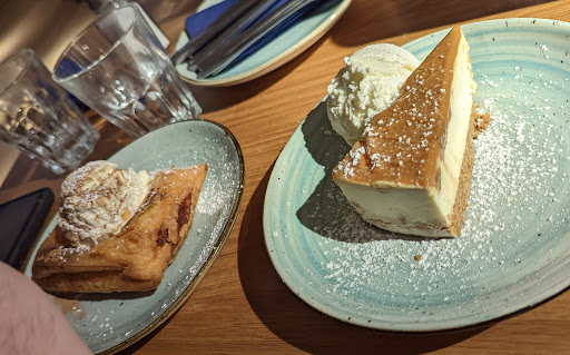 Read moreNot the best experience for our first time here. Going to the RealGreek was the friends choice, not ours. It took about 20 minutes for our drinks to arrive, which was water and a sprite. then an hour for dinner to arrive. There were 4 of us and we have separate bills. Both couples ordered the £47 Tonia Buxton. For £47, I expect HOT food and larger portions. We ended up with 4 lamb meatballs, 4 prawns, 2 pieces of chicken skewers with one tomatoes and a single slice of onion, a small portion of rice and paid nearly 5 quid for a tiny bowl of chips! We ordered 4 teeny tiny bottles of Sprite at £3.45 EACH. If you order dessert, expect to wait 20 minutes for it if its Greek Filo Custard Pie. Tastes great and it was the only thing HOT the whole night. Molten Lava hot. It burnt my tongue and lips. To say services was slow would be kind. We were there 3 hours. We left at 9. By 11pm, I was hungry. It was so noisy we couldn't even talk to each other. 15 women at the table behind us were let out on a Hall Pass and cackled the whole time, like they had never been out of the house before. Also, at the very bottom of the menu, you will miss the note saying a 10% optional service charge will be added to your bill regardless of the size of your party. As a couple of 2 ,we paid £99.. We didn't see the note and were NOT informed it was OPTIONAL. They got a £10 tip. The server worked hard considering she was 1 of 3 there on a Saturday night and the placed was standing room only. Thanks, but no thanks, we...
