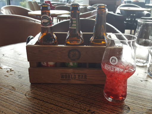 Came here twice on Saturday 12th February while staying locally for Crufts on the Sunday. My first review would have been 5 stars. We came in for lunch which was fantastic, service great, not too busy. Clean, spacious, amazing food, good choice of craft ale, Guinness and a superb selection of gins (over 100 I think). The food was delicious, vegetable samsosa, fries, chicken strips and a Southern fried chicken burger. A selection of mango chutney and a spicy curried ketchup accompanied it. However, when we came back later on in the evening, about 8pm, despite only having a couple of drinks, the service was terrible. It was busy, approximately 15 minutes to get served but the waitress we had, had no spatial awareness at all. A poor chap next to me desperately trying to make eye contact with her was ignored about 3 times (till I said something) as the same waitress also tried to bypass me and serve someone else who rudely interrupted. The waitress was then very rude to that chap and told him she had no idea he was waiting (she wasn't blind). After being served by her and experiencing this, it marred the initial great experience so I couldn't possibly leave a perfect review. However, please visit The World Bar, please enjoy the amazing food, but be cautious that it gets very busy in the evening and may get poor service! I also want to add that there was live music being set up for the evening which we didn't stay for. Table space is limited (lots of reserved tables for 9pm), so get in...