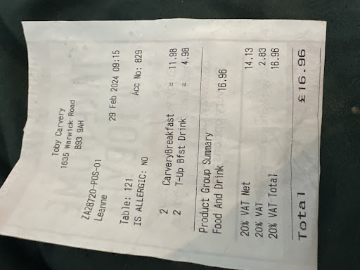 Read moreService was great from walking from the door, welcomed by a lovely young man, who was polite, escorted to the table by another young .an who again was polite. Waitress was lovely she was bubbly, very engaging and helpful. Started with drinks, carling was flat and have a funny line cleaner taste to it... Food: well, sever at the hotplate looked very unhappy, as a family we actually felt like we were and inconvenience to him as he wasn't on the hotplate to start with, he looked to be in the kitchen area chatting. We had no hello or pleasnetries, his first words to us was "yep", my mother asked for sausages, he replied nope you can't have um, there only for the king-size!" Which actually was what we had ordered. No apology for assuming! He was very short and sharp with his tone. He continue along to the meats "which one" very sharp! He threw the meats on the plate, with no care or presentation, moving on to the server yourself, all spoons in were under the halogen lights these were extremely hot to touch. Very dangerous. The stuffing was rock hard, the roast Potato's were burnt, the vegetables were dry, this could have been due to sitting under the lights so long! Someone changed the mash potato whist we were there but it came out very dry. We returned to out table, the waitress asked if everything was OK. We said it's OK but wouldn't actually rate the food. She apologised to us. We finished our meal, paid and left, I personally won't be returning to the toby...