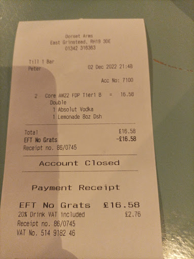 I’ve been a customer of the Dorset Arms for many, many years. Although I only visit once or twice a year my association with the pub goes back decades. A couple of times a year I like to walk from Horsham to East Grinstead. I usually go to the Dorset for drinks and a pub lunch. The food has always been at worst OK and at best very good. The service we enjoyed during the pandemic (2020 / 2021) was really quite remarkable. The waitresses / bar staff did their very best under difficult conditions and were duly rewarded by me with generous gratuities.