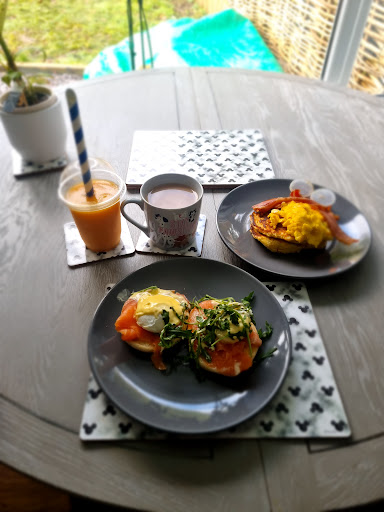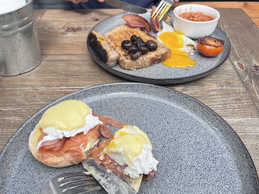 Some specifics - it's not a huge place, and it does get very busy. They don't have paper menus - you can scan a QR code with your phone (or, if you don't like doing that - I don''t - google the name) and it's really easy to find the user-friendly online menu. We wanted one of the dishes modified and they were happy to accommodate us. Avocado and poached eggs on sourdough toast, poached eggs on a toasted muffin, two coffees, £22 and change.