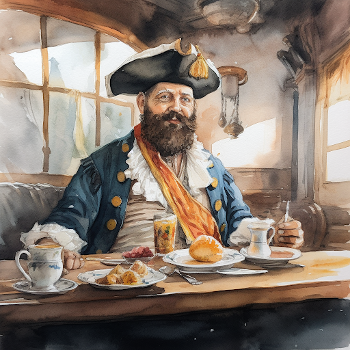 Arr, me hearties! Gather 'round, as I regale ye with a tale of a fine mornin' when I, Captain Blackbeard, discovered a landlubber's establishment known as the "French Affair." T'was a time when me crew and I had just docked our ship, the Salty Seagull, in a quaint port town, famished from our adventures on the high seas.