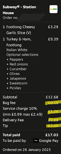 Ā Ā Ā Read moreI ordered for 6 inch Mexicana Beef Crunch with double meat, i only put red onions and pickles down for the ingredients, But It contained sweetcorn in my sub. As I was eating after couple of bites I noticed sweet corns in my sub. So went to the staff to make sure I made the order right. He checked for the order to make sure I didn't opt for sweetcorn, after confirming it his response was outright rude. Saying there is only one or two sweet corns in there, so we can't do anything about it. So i was not happy, because I've worked in subway as a sandwich artist before, I know that's not how you reply to a customer. So i opened the sandwich and looked for sweet corns I found 5 more sweet corns and when I confronted them about it. They were like ok we'll make you another sub and I sat down. Few minutes later another staff came down to me and talked with me explain that and Mexicana Beef already contains sweetcorn. But that was nowhere mentioned in their menu. So it's a problem with their menu system as well. But they refused to give me refund or another sub. I paid 6.49 pounds, very disappointed, If it was not for the staff that who came and talk to politely I wouldn't even...