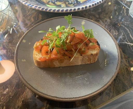 We started with wines that were excellent. I got a sweet wine (Zinfandel Rosé) and my husband got a red wine that was incredibly flavorful and smooth (can’t remember the name at the moment!). We ordered the Bruschetta as an appetizer, and it was served to us with the bread still hot as if they had just taken it out of the oven - delicious!