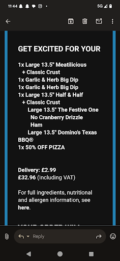 Read moreI ordered a pizza half and half with no cranberry sauce, I have an emailed receipt proving this. I contacted the customer service team as my pizza came with cranberry sauce. They provided a photo to show that on there side of things they didn't receive the order to say no cranberry sauce, which I could respect. However the attitude, sarcasm with capital letters with quotations was immensely infuriating, how dare they, for all they know someone out there(not myself) could have been allergic there response was to deny any responsibility for there being a clear fault within there order system as there side of things didn't add up to the receipt they provided to me and my order via the app. After a heated back and forth I am still arguing with them and have had no recognition for there mistake. I will NEVER again be recommending or eating a dominos ever again. I think it is absolutely appalling and want to spread the word in case there ever becomes a more serious case...