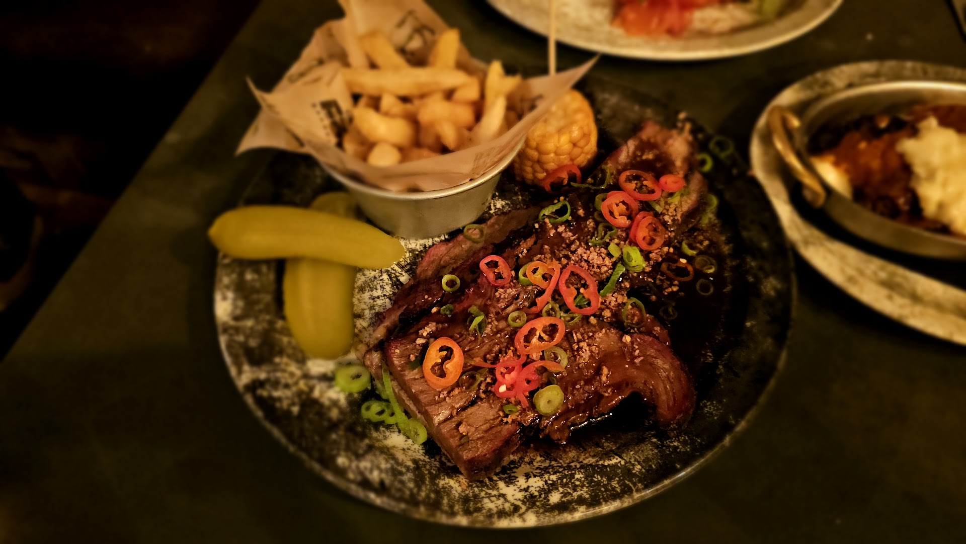 The food was OK. We ordered nachos to start with and they were delicious. No complaints here. For mains we ordered the salt and pepper brisket which didn't have much flavour at all, and just didn't work with the salt and pepper 'sauce water' that was poured all over it. My wife ordered the ribeye which was very good - although on the small side for a ÂŁ30 steak. We ordered a side of onion rings which were lovely, and mushrooms with hot sauce and gouda which were just... Well... Gross. It tasted like a bottle of Frank's Hot Sauce was poured onto them and some blocks of melted cheese - we ate one each and left the rest because they were just off putting.