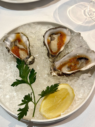Taittinger by the glass. Oysters were Lindisfarne and of excellent quality.