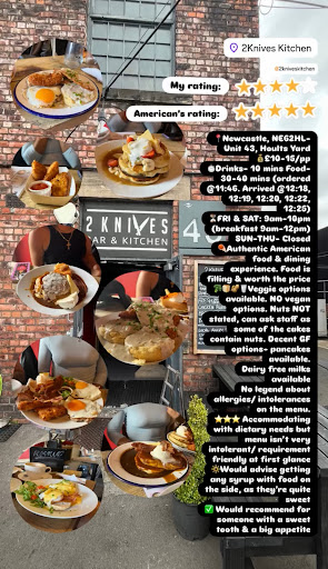 Read more2 knives bar & kitchen 📍Newcastle, NE62HL- Unit 43, Hoults Yard 💰£10-15/pp ⏱️Drinks- 10 mins Food- 30-40 mins (ordered @11:46. Arrived @12:18, 12:19, 12:20, 12:22, 12:25) ⏳FRI & SAT: 9am-10pm (breakfast 9am-12pm) SUN-THU- Closed ☄️Authentic American food & dining experience. Food is filling & worth the price 🥦🍞🥜🥛Veggie options available. NO vegan options. Nuts NOT stated, can ask staff as some of the cakes contain nuts. Decent GF options- pancakes available. Dairy free milks available No legend about allergies/ intolerances on the menu. ⭐⭐️⭐️ Accommodating with dietary needs but menu isn’t very intolerant/ requirement friendly at first glance 🔆Would advise getting any syrup with food on the side, as they’re quite sweet ✅ Would recommend for someone with a sweet tooth & a big appetite