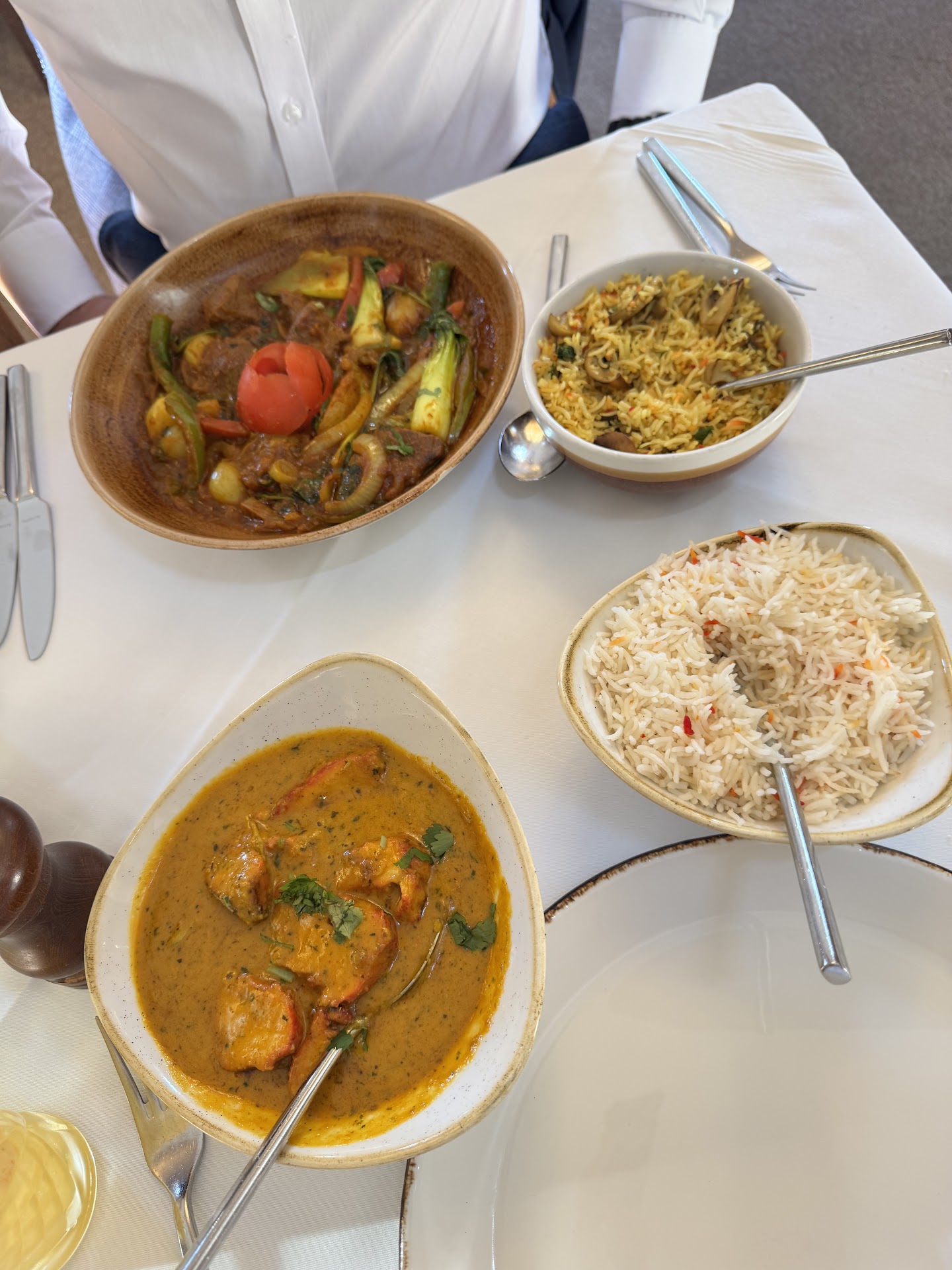 Amazing delicate and complex flavours with just the right portion size. We could not make up up minds which was the best dish so we had to settle on the butter chicken, chicken bhirina and naans. As ever ordered too much rice. As I am writing the review my favourite was the sag aloo. It surprised me with a spicy kick, but OMG it was good. I did share it out evenly, honest!