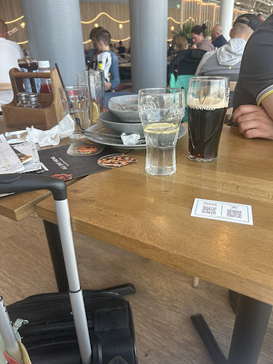 Went here before jetting off on our family holiday but really wish we hadn't! Thought i'd treat my wife and 2 kids (5 YO & 18 months) to something other than fast food so didn't mind paying a bit extra in the hope for something half decent... Sat down, no kids menu... not a great start. Also no prices stated on the menu at all,. Oh well, we're on holiday! So just went to the bar & ordered 4 x adult meals (2 x Burgers with fries, 2 x bangers & mash) + 1 pint Larger, 1 x coke & 2 x ribena kids drinks. Barman says £71 please. HOW MUCH?!? i said in my head, but thought okay we are on holiday after all so just paid without fuss as i also appreciate we were in an airport so things are always more expensive but at least it would be a nice meal for us all... How wrong I was, all 4 meals were literally identical to 4 boil in the bag Weatherspoon meals (which are fine for the price btw but i'd just spent 71 quid!) Burgers were ridiculously average, chips okay but the kids took one mouthful of mash & one bite of a sausage each and didn't touch the rest. I tried the sausages, absolutely disgusting... dry, burnt and must have been cooked days before then reheated. Mash tasted like it was still half frozen, absolute rubbish. So this resulted in 2 cranky kids on our flight due to them being hungry and then just eating snacks the whole time. The only thing that was decent was the pint of larger, but i guess it should be at £7 a pint! DO NOT EAT HERE, certainly do not ever take your family. Go a bit further down the terminal to Burger King and eat for half the price, like i wish we did. Thanks for putting a downer on the beginning of our long awaited family...