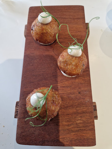 Read moreWe came for the Prix Fixe lunch menu for 2. The bread was very warm, fluffy and fresh, served with a creamy butter and flavourful tarragon salt. For starters, we ordered a fishcake, and a tomato and mozzarella salad. The fishcake was pretty good, soft and flaky, and I particularly enjoyed the charred green vegetable that came with it. The salad was probably my favourite dish, with fresh tomato slices, soft mozzarella, crunchy croutons, tangy balsamic glaze and a very nice pesto too. There was a lot going on, but it was immaculately presented and the components worked very well together. The intermediate course was mushroom arancini with truffle mayonnaise, and I thoroughly enjoyed the crunchy, bite sized dish with the discernible flavour of truffle. For mains we ordered a spring green risotto and sea bass. The risotto was nice, but had a very large portion and was very creamy and filling. I though the cheese crisp and veggies added a nice touch. The sea bass was also pretty good, with a creamy sauce and mussels. For dessert we ordered the sticky toffee pudding and passionfruit gateau. The pudding was simple yet tasty: warming and of high quality, with the crunchy toffee and ice cream adding a nice touch. The gateau was very unique with exotic fruity flavours, consisting of an outer chocolate layer encasing a white chocolate mouse as well as a jelly and crumble. It was the most unique course of the day.