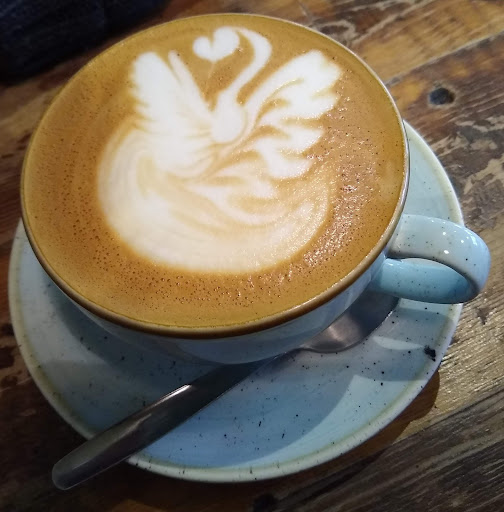 Read moreThis seems a nice independent café to support. Fairly busy for a Monday lunchtime in a time of Covid restrictions. They don't take bookings on the day, but they do have additional space upstairs when the more crowded downstairs area is full. Quite a few coffee options and we heard they use 2 shots per cup so I went for the large latte and found it lacked coffee flavour, so shots obviously not very strong. Husband's smaller latte was much better. Totally awesome latte art on both!
