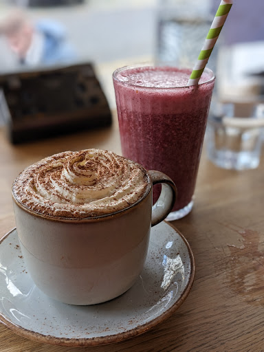 Been here quite a few times now which says it all really. Cosy café in a great location with a cute interior, pleasant staff, and a decent selection on the menu. So far, I’ve had the Plant-based Sausage & Bacon Sarnie / Halloumi & Plant-based Bacon Club Sandwich / Veggie Full English - all pretty tasty, the latter especially, just think the portions should be bigger for the price. I’ve had better plant-based bacon but still nice. Not too keen on the plant-based sausages, find them quite dry and tasteless but that’s really the only thing I’ve not enjoyed. The Honeycomb Latte is fabulous, I get that every time I come here. Yet to try the desserts but they look delicious. Always love to see an independent do well. Would totally recommend. Tip if you’re able, we’ve really got to support local businesses more than ever, what a miserable world it’d be if the chains were the only ones...