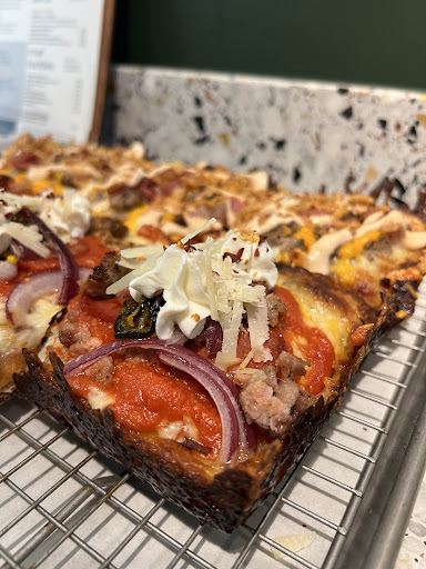 It’s a small pizza place with not a lot of seating. The only seating inside were bar tables but they had regular tables outside. Wasn’t a problem for me.