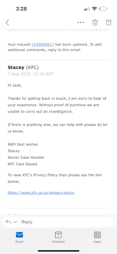 Read moreThis is usually our go to KFC, food is fresh, service is fast and customer service is good, never had an issue. However, on this occasion we had the worst experience. Service was slow however it was busy therefore understandable. We were then given the wrong drink which we noticed and returned whilst still at the window. We received the ‘new drink’ which was actually the same drink as before with the correct flavour mixed into it. There were chunks of the old drink at the bottom and it was visible that the Oreo had been added on top of the milky bar. We had already left the window at this point so parked up and took this issue to the counter where we were greeted with attitude and giggles from the member of staff who replaced the drink. All members of staff were staring at us and laughed as we left the store. I’m not sure if this was a new staff member, as we’ve never had a problem before, or maybe this member of staff thought it was the correct way to rectify their mistake but it was completely inappropriate and potentially dangerous. The rest of the meal was okay but considering the wait could’ve been hotter. The lady who served us at the window was lovely and very apologetic on the return of the first drink, I believe that she was new as it sounded as though she was under...
