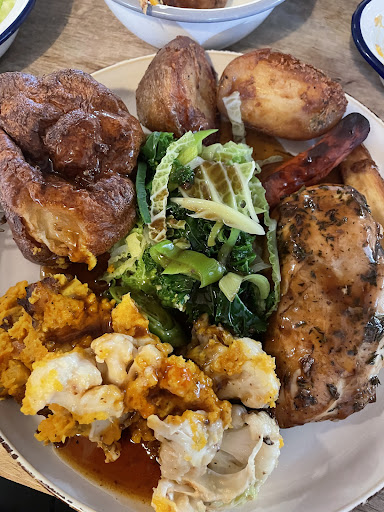 The first time me and family have ever gone out for Christmas dinner instead of cooking. Unfortunately was a bit of a let down. We paid £100 per head arrived to a shot of something nothing for the drivers or children though, canapes arrived on a rustic presentation board with a selection of three in a large amount. There was a prosciutto and goats cheese one which was the only one people ate as the pesto and salmon one were not the best. For starters I had sweet potato and coconut soup which was really tasty, unfortunately I then had to wait two hours for my dinner as the kitchen could not cope or not set up for the months ahead pre ordered food which were all the same turkey dinners apart from one for our table. When the food did arrive we all started eating before the veg arrived as really hungry at this point. The food was piping hot and tasty but alot of people on my table had lost interest by this point and alot was left, I like my food so mine and one other the only empty plates out of ten. At this point the second sitting of people had arrived for our table and many others, the front of house staff remained professional and friendly under alot of pressure from people not happy. Dessert was ok unfortunately everyone just wanted to leave at this point and didn't even bother with the coffee and mince pies included. The waiting staff were all lovely and clearly stressed and apologetic, we had a round of drinks taken off our bill to apologise for the delay. We left four hours after arriving once we finished our desserts. I think we'll be...
