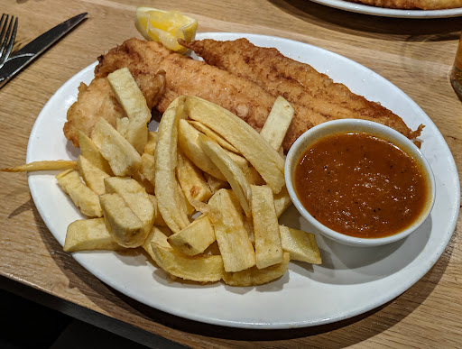Read moreHaving visited Squires for many years, bringing friends and family, I don't doubt for one minute that they are the best fish and chips (and chicken curry) and it's always a meal we look forward to booking, but the last few visits the service seems to be slipping. Go back to August when we booked a table for 9 of us. We arrived to be told we were being seated on two separate tables, not even near each other. Finally after getting someone else to help it was sorted, but this shouldn't have happened in the first place. If the system lets you book a table for 9, you expect to be able to all sit together. The next gripe over the last three visits..don't offer unlimited chips if you aren't going to fulfill the promise..on two occasions Cherry asked if we wanted more chips yet they never turned up at all (today's visit being one of these instances) Being seated upstairs in the corner it was difficult to flag a member of staff as they were clearly run off their feet..finally when I could get someone it was 20mins later and frustration had set in so we asked for the bill instead. We would have ordered desserts but because of this I just felt I'll go to the Coop and take a pudding home instead. Thirdly just a bit of feedback for staff when serving drinks. It's not seen as hygienic to hold the glass from above with fingers touching the parts of the glass where customers mouths will make contact. Glasses/cups/mugs should be held at the base...