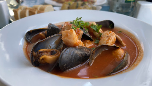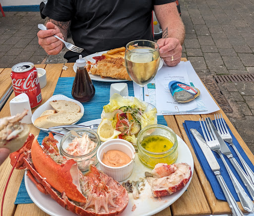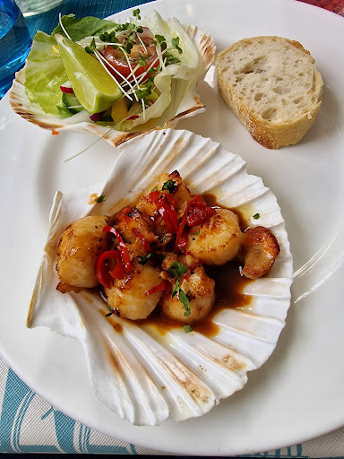 We shared a dish of olives and a plate of scallops, then had mussels in a creamy sauce and fish stew. We wanted pudding but the generous helpings made that impossible! Everything was precisely spiced and delicious. All the produce (well, apart from the olives!) is locally sourced, the fish landed yards away earlier that day. It may be on the menu, but if it wasn't caught, it isn't cooked. Oh and a Bellini and a Combe Cooler added a little something...