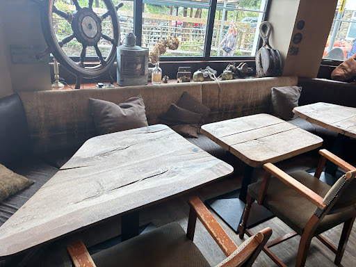 4 stars for atmosphere because initially the woman we talked to when we first arrived was very polite and the overall atmosphere of the establishment was very relaxed. The tables we were sat on were quite uneven which looks nice but many areas especially on the corners you canāt put a drink on or it will fall and spill.