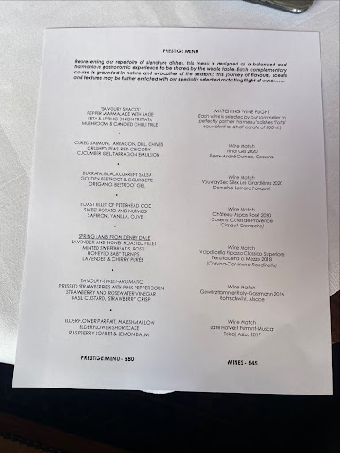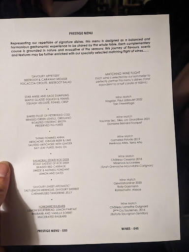 This was a real dining experience. The surroundings are beautiful and tasteful and the dining area is small, cosy and select. We had the tasting menu with the matching wine flight and it was all delicious and very flavoursome. The seven courses were quite small with the exception of the main roe deer course, but we felt comfortably full after we had finished. The ingredients complimented one another and the presentation was second to none. Compliments to the chef.