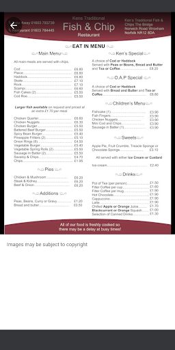 We have used Kens for around 10+ years not regularly but whenever we have been in Wroxham. (own our own boat kept at Stalham) and found the food normally very tasty and the fish of a decent portion with nice flakes of cod!! Yesterday on the way back from Coltishall we moored near the viaduct and deliberate d whether we had Indian, Chinese or fish supper (wish we had chosen Chinese now!!) anyway we decided on fish supper as we both said your fish and chips cooked in beef dripping are normally lovely!! Ordered cod, chips x2 mushy peas and wally ÂŁ29 after a 20min wait for them we wandered back to the boat to consume paper unwrapped and the first thing my wife said look at that a tiny portion of chips and the thinnest piece of cod ever!!!! On opening mine I must say the portion size was better but the cod wasn't that nice as looked like it had been overcooked as some of the batter and fish was a tad hard!!! Chips were OK ish, service in the shop was OK ish although the girl who took our order asked 4 times if we required salt & vinegar even after the first time we had said yes please!! Have standards dropped? We asked ourselves? We use Fred at Broadland chippy regularly and never had a bad supper from there!!! And at around ÂŁ7 cheaper far better value for money than yours!!!