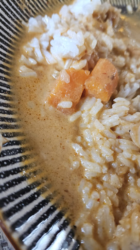 Greasy beef thai green curry. With three chunks of raw pepper.