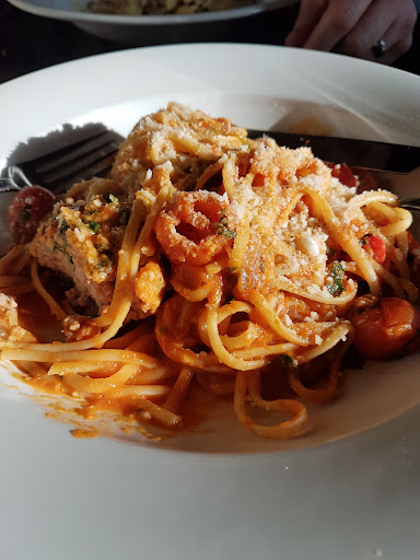 4th The Mains....25 minutes after our starters had been taken away, our main finally came. I asked "was any of this microwaved" Reply " yes!, just the Seasonal Veg"....Me "ok I am not eating that". Servers reply "I can swop it for salad, bread ect". I was not impressed, who wants salad with a hot Salmon in a sauce you want Veg, right!? anyways I went with Salad. Whilst the server had gone for the salad I take a look at my Salmon, peel back the skin to find this Fatty consistency, who gets fat on Salmon ?? and the salmon was mushy... turned to my Boyfriend to see his face after eating a little of his pasta, totally tasteless the same sauce the meatballs came in and when tried one of his Prawns he then passed me one to try.. this was the most chewiest prawn I had ever tried. Yes you got it, we did not finish eating the prawn it went straight back on the plate.