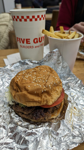 Read moreHad a little hamburger "all the way," medium fries. Hamburger was fine but the mushroom and tomato made the bread a bit mushy, there was very little in way of lettuce, onions and other additions compared with when five guys launched in the area years ago. Five guys as a company isn't loading on with additional fries on top of cup as they once did, probably get about one cup and third rather than twice the cup quantity of fries as they used to do. Maybe was just a launch gimmick though? The fries here and at another local branch were luke warm and floppy so not sure of change to cooking procedure, but they definitely weren't crispy. Tried another branch just to see if experience was the same, and it was.