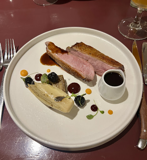 Mains: Pan-Seared Duck Breast and 8oz Fillet Steak (served with seasonal vegetables and skinny chips)