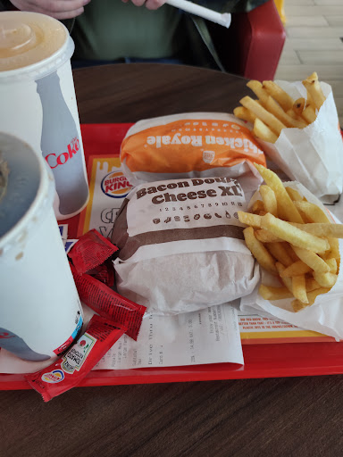 Early Sunday afternoon visit whilst shopping in the area, decided we wanted a, quick bite due to time constraints. For a normal outlet I would say it wasn't busy, however for the layout and team ability of this site they were pushed. Layout means you don't quite know where the queue to order is and who's already ordered. It isn't helped by the yellow wet floor signs placed in a line in front of the tills and seating area. As the floor wasn't wet I'm unsure why they were present as the girl maintaining the cleanliness of the seating area was excellent, she never stopped. I got the strong impression that most of the team were new/learning being directed by one person who was also taking drive in orders given they presented as timid and unsure whilst he was clearly more stressed trying to keep a level of order/service. Wait time for the food was reasonable and temp of food OK. Chips were hot, burgers look warm. Whilst I accept there is a cost of living increase value for money is very poor, two large meals, came to under £20 which a large chip being anything but large. The seating area was clean and furniture relatively new however the toilets are the opposite being very out of date, years of poor attention to detail showing from the ground in dirt on the white cubicle door and the daddy long legs en wrapped in a cobweb on the floor confirming the floor hadn't been properly cleaned in a while within the bathroom facilities. Not somewhere I'd return anytime soon in it's current state and for the price I wish I'd made time to support smaller local businesses. Compared to other burger Kings its disappointing. The site in on ground floor and have an...