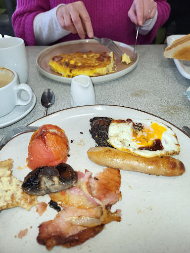 Read moreThe fact that this place opens on a Sunday morning early is just one of the good things about it. It was cosy and packed on a cold day and we were in for breakfast. The menu is not extensive or trendy: no smashed avocados here! However, eggs, bacon, sausage, puddings, etc and my smoked salmon scrambled egg was good. Also lots of pastries and cakes. The toast was plentiful and you'd wonder why they wouldn't put a butter dish out instead of like ten pats of butter in tinfoil to be unwrapped and create mess. The tea was weak and disappointing, but plentiful too which was badly needed. My mocha with extra shot was okay, but not very chocolatey or very strong on coffee taste. It was a real downer that when we asked for jam, it came in individual little glass pots, at 40p each. It was a mean-spirited kind of a cost for three people who already had spent on three breakfasts, pastries, cake, extra toasts, coffees and teas etc and the kind of thing that would put you off a place. The view of the Foyle is wonderful and I imagine that in summer there is outside seating. For November, a window seat was lovely. A real nice Derry thing: when we arrived there were only three seats in a row on high stools free. A lovely couple got up from their three-seater table and invited us to sit there, while they sat at the window. Where else...