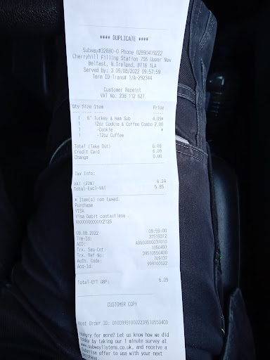 Ordered the classics meal deal 6 inch turkey and ham on the board behind the till it says £5.59 that's the deal price with a drink and a cookie girl had made it all up then charged me £6.09 so asked the girl is that not a deal for £5.59 she said no prices had gone up it came from head office it's not her fault as quick as she could she had thrown the receipt in the bin so I asked for another one to find she had charged me for a coffee and cookie combo and the sandwich was charged separately instead of the putting it as a meal it's not a big lot of extra money but the price of things is bad enough at the minute without trying to squeeze more out of people I've been to other subways and been charged the proper price but this place always seems dearer and that's why so check your receipts maybe head office should...