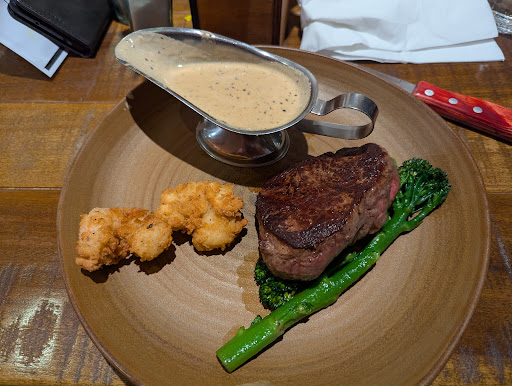 The food I got was a surf and turf. I asked for medium/rare and I got well done(grey from end to end) which is a ruined fillet steak. I nicely said that it was overcooked and I had to show it cut a few times to convince them??? Unreal. I gave the plate back, they took it away and I had to wait another 20 mins for my next surf and turf to be delivered to my table. I could NOT believe when they set Infront of me. They set an empty plate with on fillet steak Infront of me and with none of the sides (broccoli, pepper sauce, garlic prawns or anything). I sat there for 5 mins thinking they must be bringing me out the sides, but NOOOOO they were only going to give me the steak with nothing else. I had to stop that friendly gentleman and tell him the problem. He apologised right away and within a few mins I got everything else that was missing. However at least the steak this time was actually medium/rare.