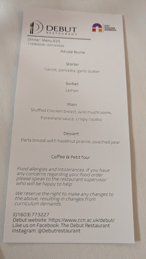Read moreSpacious, welcoming modern ambiance, festive menu eclectically well planned out. Service (teaching college) from student staff were sublime, so credit to their mentor. Wow, now the reason why Debut is top restaurant for the regulars who experienced its all round performance. Food worthy of Michelin 4 ☆ I feel. Artistic, tantalising, festival of fine food. Thank you, Mr Bartlett, you should be so proud as mentor to...