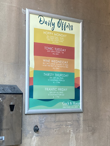 Read morePutting this on here mainly to see if anyone else has experienced this. I have historically enjoyed the cock and hoop (I even stayed in the adjoining hotel before my wedding), but I’ve had two strange experiences recently. The last two times I have been here, I have asked for the daily deal advertised on multiple signs - the first was a pizza and pint deal in March, and the second was their wine Wednesday deal today. On both occasions, I was told that the deal was no longer running, despite the sign being outside (one of which would have had to have been actively put out that day). On the second occasion, I was told the deal had come to an end two weeks ago - in which case, why was the sign out? To further thicken the plot, their Instagram post exactly 2 weeks ago (the day I was told the deal had been cancelled) advertised wine Wednesday, with no indication that the deal was coming to an end. I find this baffling, and really damaging to my opinion of and trust in the pub. If you are not running a deal, that is fine, but you should make sure you are not advertising this deal. It may well be that I was just unlucky, but the repeated incidents makes it feel as if the deals...