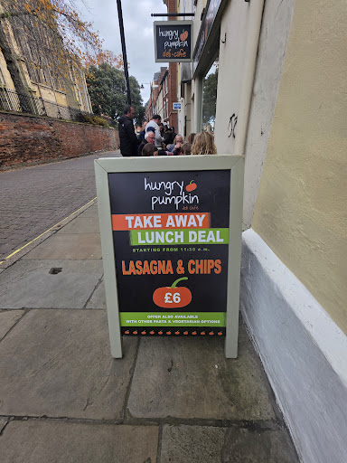 Read moreWe moved to Nottingham City a few weeks ago and The Hungry Pumpkin Cafe/Restaurant was on our short list to visit. It was easy to find, very cute outside, a few tables and chairs to sit and enjoy a meal on a quiet back road. Beautifully decorated inside, surprisingly large with quite a few tables to choose from. You can tell that the locals walk in and out throughout the day because many of them popped in to pick food up while we were there. The place is absolutely spotlessly clean. Andrea greeted us with the most welcoming smile, we instantly felt at home. The food is all home made, and the chef had no issues changing things up a bit with adding fresh vegetables to my husbands meal. Everything was so delicious and we finished every morsel on our plates. My hubby had dessert, and we ordered some to take home for later because it was scrumptious. If you're looking for a simple snack or a delicious home cooked meal, then visit The Hungry Pumpkin on High Pavement in Nottingham City Centre. We're definitely going to become...