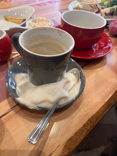 Firstly, we ordered a tea and a flat white and some food (one of the wraps being a vegan one) and when the tea came the waitress said "here's your decaf tea" and we said we didn't order decaf and the staff said "oh we don't have regular tea so we're just doing decaf is that ok?" and I didn't want to cause a fuss or waste a tea so we just accepted it as it was. The flat white was awful - full of foam. I'm not a coffee snob by any means but it was an awful coffee.