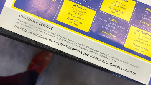 Food ordered and I notice a price hike compared to the menu. I ask to see the ticket and mention the price difference. He replies "Theres a 10% charge for eating in". What?! I laughed again briefly in disbelief. It's a takeaway, not a restaurant. There are those who will claim "Its normal, loads of places do this". To those people I say "Do Mcdonalds, Burger King, Maryland, Pepe's, Chunky Chicken?, no, because it's stupid". It's like they've forgotten they're a takeaway and not a fancy diner.