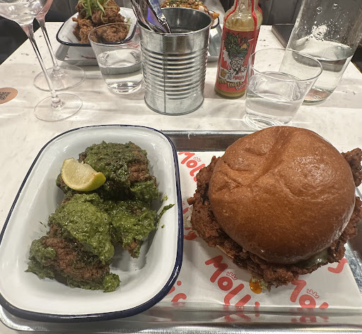 Read moreMollis Fried Chicken has garnered a reputation that, unfortunately, doesn't quite match the reality of the dining experience. 👎😞 Despite its hype, the flavor profile of their chicken tends to fall flat, lacking the robust seasoning and depth of flavor that one would expect from a top-tier fried chicken joint. 🍗 We ordered the Thai-Pesto Saty wings🇹🇭, Salt and Pepper w/Hot Honey tenders🍯, Nashville Hot Oil Sandwich + BBQ & Miso Ranch loaded fries 🍟