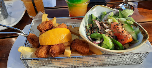 The outside menu was more extensive than I had expected. Many bars are offering a very limited menu in post Covid times and so I was pleased to see a good selection available to suit all diets, from Italian favourites such as Lasagna and Gnocci, American style options including stacked burgers and onion rings, sharing platters and light salads through to vegetarian options and the British national favourite – Fish and Chips. It is hearty pub grub with a modern twist and quite satisfying to the palate. I opted for a rather simple Scampi & chips, a timeless classic. The bar was happy to bring me a side salad to accompany this dish instead of the options of peas which was on the menu. I had expected a rather basic side salad, perhaps with some red onion thrown in for a splash of colour, so it was a lovely surprise when they brought me a rather more impressive side salad which contains the following: