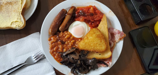 The menu is on a blackboard behind the counter as you walk in. There's daily specials as well as burgers, toasties, jacket potatoes, and kids' meals. But we're here for, you guessed it, breakfast. There's a small breakfast at £6.50 for the lightweights. Or what we chose : Large breakfast £7.50 2 x Bacon,2 x sausage,1 x egg,1x hash brown, beans, tomatoes, mushrooms,fried bread, and toast. Of course, we had to have The Belly Buster £9.50 3 x bacon,3 x sausage,2 x egg,2 x hash brown, Beans,tomatoes,mushrooms, fried bread, and toast. Both breakfasts include a tea or coffee with a refill if you want one.