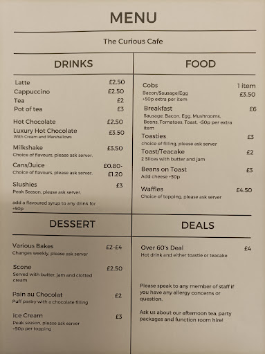 The menu is simple Tea and Coffee various cakes and baked goods sandwiches just the usual tea room items and many at £2 each.