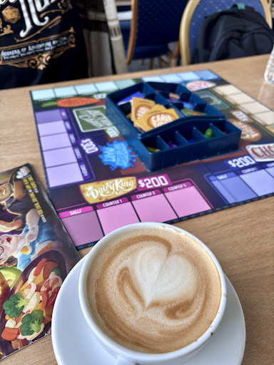 Will start this review off just to say how the process works here for any first timers reading as there's very little knowledge to find about how these board game cafes work, basically this one as we were told by a nice member of staff that we can purchase the food, drinks and games there. And if we would like to play any games in the cafe you have to pay a coverage of 5 pounds per individual. Up until closing time. Which we did, now this is where I personally got a little confused because we paid our five pounds each to play the board games there although we weren't given any reciept or really anything to prove that we paid that 5 pound coverage. My girlfriend got herself a cola and red velvet cookie. I got myself a latte that tasted great. We sat at the front near the counter were you pay for all services to have our food and drinks before playing a game, only because with our little knowledge we weren't sure if you were allowed to eat and drink while you play. We don't like to step on anybody's toes you see. We asked a girl working there if it would be possible to play games on the table that we were eating on and she said yes although went on to say about the coverage charge. We told her we paid and that was that but I felt a bit uneasy having nothing to prove it to her you know, also after playing a long game of scrabble it seems that I seen people have drinks at least while they played. So i believe you may be able to drink and eat while playing but I'm not completely sure. Now other reviews do say it gets cold inside and they are right it was pretty cold. I put on my jacket though and problem was solved. All the staff were really friendly and a worker took the time to say bye to us even though he was in the middle of something. Lovely...