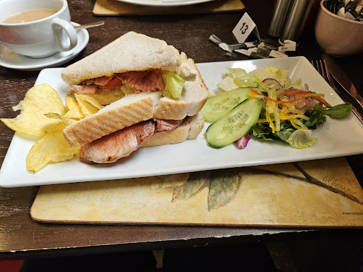 We thought we'd try this new venture in Nuneaton Town Centre. We didn't really know what to make of it. The menu is posted at the door and it's an eclectic mix of things like roasts and steaks plus sandwiches and paninis. The menu is not very inviting though, very poorly presented. Under roasts it simply had chicken, beef etc, no mention of what it came with. A similar story with other things. What on earth is a vegetarian panini? No explanation at all. No indication as to whether you have a choice of bread for sandwiches and no mention of the salad and coleslaw that came with them. For a new place the menu was s little tatty too. Some seating outside but there were too many smoking so went inside. Lots of comfy armchairs and sofas at the front with a more formal dining area at the back. We ordered a tuna mayo sandwich and ham/cheese toastie with two diet cokes. Prices were reasonable. The service was pretty quick and the cokes arrived quickly but they weren't cold, very basic fail! The tuna mayo sandwich was ok, the salad fresh and the coleslaw was of the cheap kind. The Ham and cheese toastie was also 'ok' using very thin bread with same salad and coleslaw. It was ok. We normally have a piece of cake and the menu mentioned some, but I like to have a look at cakes before I order and the cake stands at the bar area were empty. Instead, we got two great cakes to take away from the Cowshed at Poplars Farm. It says it's a bistro but it's not open in the evening? Is it a cafe with no cakes? Confusing identity, average food when there are so many better options in town? Do the owners have any experience in hospitality as it really does itself no favours against the competition in town. I wish it well, maybe these are 'teething' problems but unlikely to go...