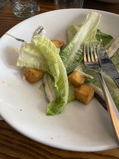 My salad was probably the saddest salad I’ve ever seen. See attached photo. Words won’t do it justice. I’ve never had full blown anchovies hanging out on top of uncut Romain leaves, but here we are. I couldn’t dare to bring myself to eat the croutons, but my partner took the plunge. Lo and behold: they were soggy and soft. Not what is ever expected. My partner’s pasta was better looking but was severely undercooked and unseasoned. A travesty.