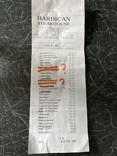 Read moreFirst visit to this restaurant and unfortunately it will remain a one and only.. We love a drink and a good night out the same as the next person, so this is just our opinion, and I have read lots of good reviews, but hey, each to their own.. We booked for a Saturday evening and arrived on time, staff were pleasant but rushed due to the place being packed with mainly loud groups. We were shown to our table that was next to a party of six guys out on a stag night, quite drunk and VERY loud, so loud that when our order was taken we had to point to the items from the menu as we couldn't make ourselves heard, other diners were having the same problem. We did ask if they had another table somewhere less noisy but all the tables were booked..Drinks and starters arrived promptly, we're hot and we're very nice. It's a shame the same couldn't be said about the mains... The steaks were less than impressive, very tough, lots of fat and gristle and not very hot, chips and onion rings were a bit underdone for me and not sure how they cook mushrooms but the tasted like they were cooked in baby oil.. We ate as much as we could.. We ordered more drinks but after 20 mins we gave up and asked for the bill that had to be sent back twice as we had been charged for things we never received (drinks) and overcharged for others.. All in all our nice evening out for a meal lasted 1hr 20mins. Whilst we understand that everyone has a right to a good night out, the management should have stepped in and asked the guy to turn the volume down a bit and cut the foul language out... I'm sure on another night it would be a different place but I'd give Saturday night in the Barbican Steakhouse...